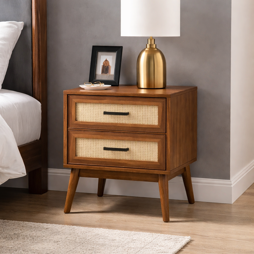 Nachttisch mit Schubladen und Ablageflächen zur Aufbewahrung von Alltagsgegenständen neben dem Bett. Geeignet für Schlafzimmer, funktional gestaltet für den täglichen Gebrauch.