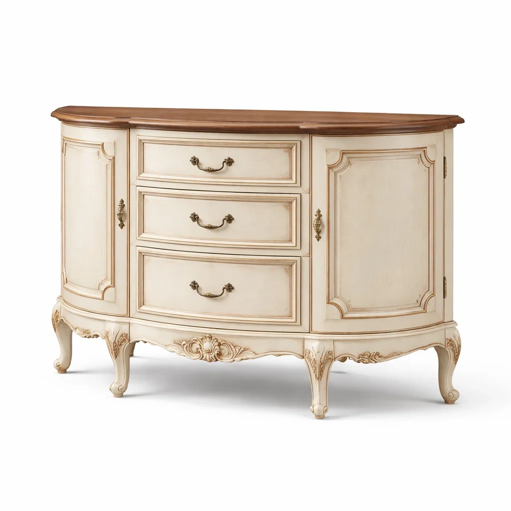 Diese Kommode besteht aus Massivholz mit Zinklegierung-Griffen. Die Abmessungen betragen 123 cm in der Länge, 40 cm in der Tiefe und 86 cm in der Höhe. Sie ist in Weiß und Braun gehalten. Die Kommode verfügt über geschwungene Beine und verzierte Schnitzereien. Sie bietet Stauraum mit 3 Schubladen und 2 Türen.