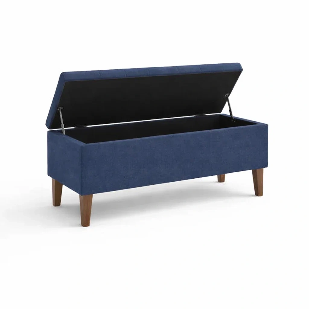 Diese Ottomane kombiniert Polyestergewebe mit stabilen Eukalyptusholzbeinen und bietet sowohl eine Sitzgelegenheit als auch Stauraum.